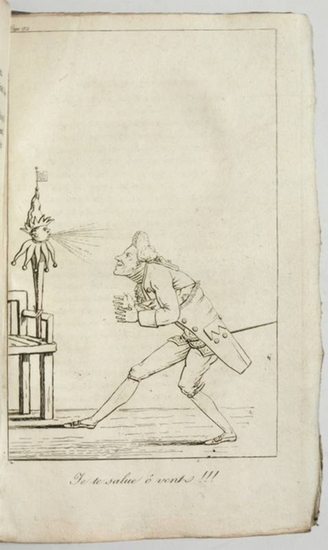 Les folies du siècle. Roman philosophique. Deuxième édition, ornée de sept gravures. Paris, Pillet, 1818. (4), 308, (4) SS. Mit 7 gest. Tafeln (dav. eine als gefalt. Frontispiz). Marmorierter Pappband um 1900, die bedr. und ill. blaue Originalbroschur mitgebunden. 8vo. Zweite Ausgabe dieser satirischen Schau auf die Ereignisse der französischen Revolution. Der Journalist und Schriftsteller Baron de Lourdoueix (1787-1860) war Redakteur der "Gazette de France" und des "Spectateur", "où il s'est toujours eforcé d'allier les traditions monarchiques et religieuses aux tendances libérales de notre époque" (Hoefer). - Einband berieben; die mitgebundenen Broschurdeckel etwas fleckig. Unbeschnittenes Exemplar. - Vgl. Hoefer XXXII, 25.