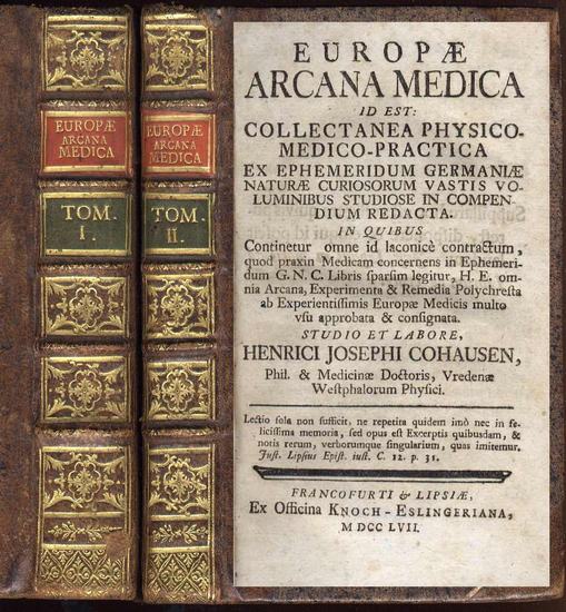 Europae arcana medica id est: Collectanea physico-medica-practica ex Ephemeridum Germaniae naturae curiosorum vastis voluminibus studiose in compendium redactata: id est in quibus continetur omne id laconicè contractum, quod praxin medicam concernens in Ephemeridum G.N.C. Libris sprasim legitur, H.E. omnia arcana, experimenta et remedia polychresta ab experimentissimis Europae medicis multo usu approbata et consignata. Frankfurt und Leipzig, Knoch & Esslinger, 1757-1760. 8°. 10 n.n. Bl., 598 (recte 596) S., 18 n.n. S. Index; 32 n.n. S., 398 S., 18 n.n. S. Index. Schöne Halblederbände der Zeit mit je 2 goldgeprägten verschiedenfarbigen Rückenschildern und reicher ornamentaler Rückenvergoldung. 2 Bände. Blake 92. (Nur Band 1). - Wellcome 2, 366. - Hirsch 6, 636 (für Salentin Ernst Eugen). - Erste Ausgabe. - Pharmazeutische Rezeptsammlung für und gegen alles. Die biographischen Quellen sind widersprüchlich. Nach Hirsch war Salentin Cohausen (1703-1779) der Neffe von Johann Heinrich Cohausen, was jedoch mit der Aussage Hirschs, dass Johann Heinrich der Verfasser des vorliegenden Werkes sei, nicht übereinstimmt. Ferguson hat das Problem auch erkannt "There were several Cohausen, and Haller, warns his reader against confounding them. He himself however, is a little bit vague and seems to mix them" (Ferguson 1, 169). Das Vorwort des ersten Bandes ist datiert mit 1757. Johann Heinrich starb bereits 1750. Heinrich Joseph nennt sich auf dem Titel "Phil. & Medicinae Doctoris, Vredenae Westphalorum Pysici". - Fliegende Vorsätze mit zeitgenössischem Stempel. Papier gleichmässig etwas gebräunt. Band 2 mit kleiner Wurmspur im Innendeckel und den ersten 20 Blatt. - Dekorativ gebunden.