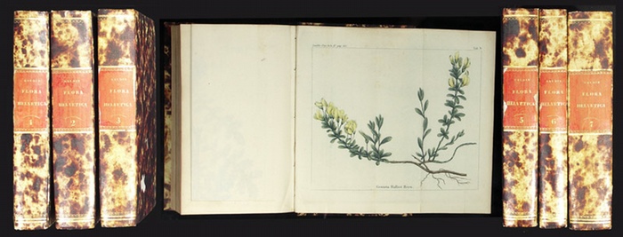 Flora Helvetica sive historia stripium hucusque cognitarum in Helvetia et in tractibus conterminis... Zürich, Orell Fuessli, 1828?1833. 8°. Mit 28 kol. Kupfertafeln. Pappbände aus der Zeit mit verg. Rückenschild und Rückenvergoldung. + Wichtig: Für unsere Kunden in der EU erfolgt der Versand alle 14 Tage verzollt ab Deutschland / Postbank-Konto in Deutschland vorhanden +, 30176AB 7 Bände. Longchamp 1153. ? Nissen BBI 691. ? Pritzel 3239. ? Junk 4444. ? Erste Ausgabe der wichtigsten Schweizer Flora des 19. Jahrhunderts. Jean Caudin (1766?1833) war nach seinem Theologiestudium in Zürich und Genf tätig, ab 1795 Pfarrer in Nyon und zugleich Lehrer für Mathematik und Naturgeschichte. Er gründete zusammen mit Henri-Albert Gosse die Helvetische Gesellschaft für Naturgeschichte. 1820 wurde er Honorarprofessor für Botanik in Lausanne. ? Band eins zu Beginn und am Schluss im oberen Rand mit durchgehendem grösserem Tintenfleck. Papier stockfleckig. Einbände berieben und bestossen.