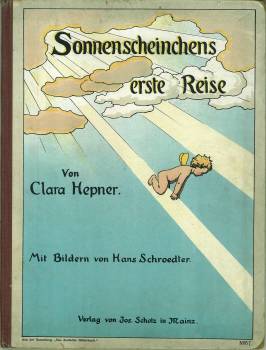 Sonnenscheinchens erste Reise. Bildschmuck von Hans Schroedter. Mainz, Jos. Scholz, o. J. [1915]. 4°. o. Pag. [8 Bll.]. OHlwd., Abbildung. EA. - Aus der Sammlung "Das Deutsche Bilderbuch", No. 67. - Ecken berieben, leicht fleckig, leichte Gbrsp.