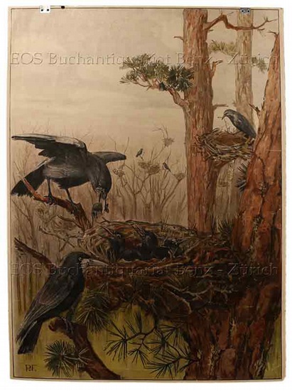 Raben mit Jungtieren. O.O., um 1930. Farblithographie auf festem Papier. Bildgrösse: 86 x 62 cm. + Wichtig: Für unsere Kunden in der EU erfolgt der Versand alle 14 Tage verzollt ab Deutschland / Postbank-Konto in Deutschland vorhanden +, Raben. Schulwandbild. - Leicht Knitterfaltig.