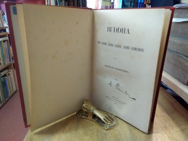 Buddha. Sein Leben, seine Lehre, seine Gemeinde. Berlin, Verlag von Wilhelm Hertz, 1881. Gross-8°. VIII, 459 S. Privater Leinenband mit handschriftlichem Rückentitel. Name auf Titel, wenige Textanstreichungen. Blätter leicht gebräunt, Schnitt etwas stärker. Titelei u. letzte Blätter braunfleckig. Äusseres abgegriffen, Einband lichtrandig, Ecken stärker bestossen, Rückenbezug oben 2 cm angeplatzt. Innendeckel mit Buchhä - Erstausgabe - SW: Buddhismus, östliche Philosophie, Mystik - Versandkosten innerhalb Deutschlands EUR 5,00 (versicherter Versand).