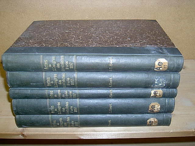 Actes du Onzième [XI°] Congrès [Congres] International des Orientalistes, Paris 1897. 5 volumes (contain sections 1-7). Leroux, Paris 1898/1899. Gr.-8°., Halbleinen der Zeit mit marmorierten Deckeln / contemporary hardcover,. Bibliotheksexemplar mit Kleberesten eines Rückenschildes und Stempeln (entwidmet), Einbände etwas fleckig und berieben, Papier gebräunt, vereinzelt kleine Bleistiftanstreichungen, ansonsten ordentlich erhalten, Beiträge in verschiedenen Sprachen (französisch, englisch u.a.) / ex-library copy with label on spine and stamps, binding a bit rubbed and stained, paper browned, a very few pages with little pencil underlinings, else fine, essays in different languages (French, English a.o.),.