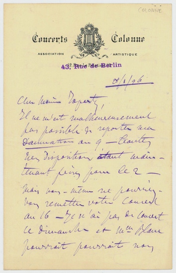 Eigenh. Brief mit U. (?Ed. Colonne?). Paris, 28. I. 1896. 2 SS. auf Doppelblatt. 8vo. An einen Monsieur Topart (?) über Terminschwierigkeiten. Es sei ihm nicht möglich, die Aufführung der ?Verdammnis? auf den 9. zu verschieben, aber vielleicht könne er (der Adressat) ja sein Konzert auf den 16. verlegen: ?Il m?est malheureusement pas possible de reporter ma Damntaion au 9 ? toutes les disposititons étant prises maintenant pour le 2 ? Mais vous-même ne pourriez-vous remettre votre concert au 16 [...]?. ? Édouard Colonne war erster Violinist des Orchesters der Opéra de Paris und gründete 1873 das ?Concert National?, woraus 1874 die ?Association artistique? wurde, deren Konzerte zunächst im Théâtre de l?Odéon, später im Châtelet stattfanden. ?Insgesamt brachte Colonne einige tausend Werke von fast zweihundert Komponisten zur Aufführung. Sein Name bleibt vor allem eng verbunden mit der wahrhaft großartigen Interpretation der Werke von Hector Berlioz. Diese, die zu Lebzeiten des Komponisten vom Publikum oft abgelehnt wurden, fanden in Colonne einen begeisterten und fähigen Dirigenten, der ihnen zu dauerhaftem Erfolg verhalf? (MGG XV, 1553). Zu den zahlreichen französischen Komponisten, die ihm viel verdanken, gehören u. a. Camille Saint-Saëns, Jules Massenet, Gabriel Fauré, Vincent d?Indy, Marc-Antoine Charpentier, Claude Debussy, Maurice Ravel, Charles-Marie Widor, Paul Dukas und Emmanuel Chabrier. ?Daneben wurden in Vergessenheit geratene Werke wie ?Fausts Verdammnis? von Hector Berlioz wiederentdeckt, auch die Werke ausländischer zeitgenössischer Komponisten wie Richard Wagner und Richard Strauss kamen auf den Spielplan. Das Orchester lud große Dirigenten wie Felix Mottl und Felix Weingartner ein, und Komponisten wie Gustav Mahler, Peter Tschaikowski, Claude Debussy, Edvard Grieg, Richard Strauss und Sergei Prokofjew kamen, um ihre Werke aufzuführen? (Wikipedia, Abfrage v. 5. X. 2008). ? Auf Briefpapier mit gedr. Briefkopf der ?Association artistique | Concerts Colonne? und Adreßstempel.