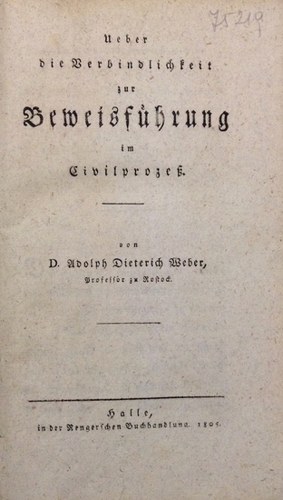 Ueber die Verbindlichkeit zur Beweisführung im Civilprocess. Halle, Renger, 1805. 6 Bl., 349 S., 10 Bl. Pappband d. Zeit (fleckig u. teilw. verblaßt, Vorderdeckelbezug oben mit Fehlstellen durch abgelöstes Etikett). Erste Ausgabe. - Leicht gebräunt.
