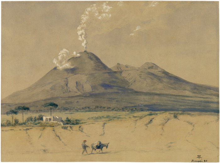 Landschaft mit dem rauchenden Vesuv. _. Aquarell und Deckweiß, über Bleistiftskizze, auf bräunlichem festem Zeichenpapier, rechts unten monogrammiert, bezeichnet und datiert ?HTh (ligiert) Pompei 80?. 35:46,8 cm. Verso an den Ecken Reste alter Verklebung. Literatur: H. Thode: Thoma. Des Meisters Gemälde, Stuttgart/Leipzig, DVA, 1909, Abb. S. 152 unten. (1858-1901) und im Auftrag seines Sammlers und Förderers Charles Minoprio aus Liverpool, einem gebürtigen Frankfurter und wichtigster Mäzen Thomas in dieser Zeit, brach Thoma im März 1880 zu seiner zweiten Italienreise auf. Minoprio hatte für sich und seine Freunde bei Thoma ca. zehn italienische Motive in Auftrag gegeben. Am 2., 3. und 8. April 1880 sind drei Zeichnungen mit Motiven aus Neapel und von Sorrent entstanden, die sich im Besitz der Staatlichen Kunsthalle Karlsruhe befinden (Ausst. Katalog: Hans Thoma 1839-1924. Zum 150. Geburtstag, Karlsruhe 1989, Nr. 62-64, Farbabb. S. 62, 63 und 64). Eine Variante des Motivs schuf Thoma 1880 auch als Gemälde.