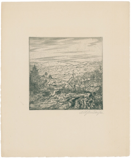 Hügelige Landschaft mit verstreut liegenden Häusern. _. Radierung mit kräftigem Plattenton, auf cremefarbenem Kupferdruckpapier, signiert. 16,2:16,4 cm. Vorzüglicher und breitrandiger Abdruck, verso mit Stempel der Kunstdruckerei Künstlerbund Karlsruhe, Nr. 114. Haueisen war Schüler an den Kunstakademien in München bei L. v. Kalckreuth (1855-1928) und in Karlsruhe bei H. Thoma (1839-1924). Tätig war er in Jockgrim/Pfalz, in Karlsruhe, zeitweilig auch in Bernau und in Frankfurt am Main. Seit 1919 war er Lehrer und Direktor an der Karlsruher Akademie, aus der er 1933 freiwillig austrat.