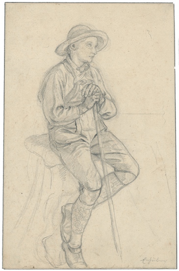 Bayrischer Hütejunge mit seinem Hirtenstab, auf einem Baumstumpf hockend. _. Bleistift, auf Bütten, rechts unten signiert ?Enhuber?. 32,3 x 21 cm. Provenienz: Sammlung Christian Hammer, Stockholm, nicht bei Lugt.- Figurenstudie, wahrscheinlich für ein Gemälde.