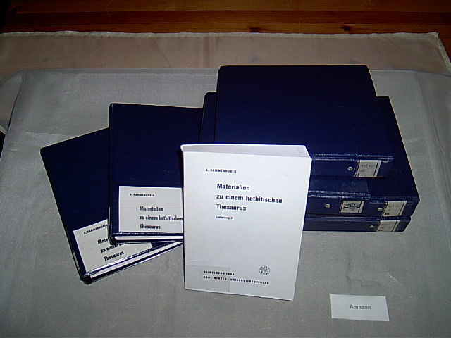 Materialien zu einem hethitischen Thesaurus. Lieferungen 1 bis 11. Heidelberg, Winter 1976 ff. Lieferungen 1 bis 10 als Loseblattsammlung in 6 Ordnern (DINA 5); Lieferung 11 kartoniert. Bibliotheksexemplare mit Rückenschild und Signaturen / Stempeln (entwidmet), der kartonierte Einband von Lieferung 11 fleckig / berieben, ansonsten gut erhalten und sauber, (Hethitisch, Hethiter, Sprache), BITTE BEACHTEN: Aufgrund des hohen Gewichtes sind für den Versand außerhalb der EU zusätzliche Versandkosten notwendig / PLEASE NOTE: This is a heavy book / set, that requires additional postage for international delivery outside of EU.
