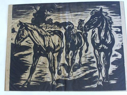 Junge Pferde. Holzschnitt auf Büttenpapier um 1932 Blattgröße 40 cm x 30 cm, auf Karton--- - Hans Jäger, 1887. Zschopau - 1955 Dresden) war ein deutscher Maler, Holzschneider und Radierer. 1904-12 studierte er bei Carl Bantzer an der Kunstakademie Dresden, 1912/13 war er Meisterschüler bei Emanuel Hegenbarth. 1913/14 in Berlin und Paris. Ab 1919 war er in Dresden ansässig. Jäger wurde vor allem durch seine Tiergrafik bekannt -.