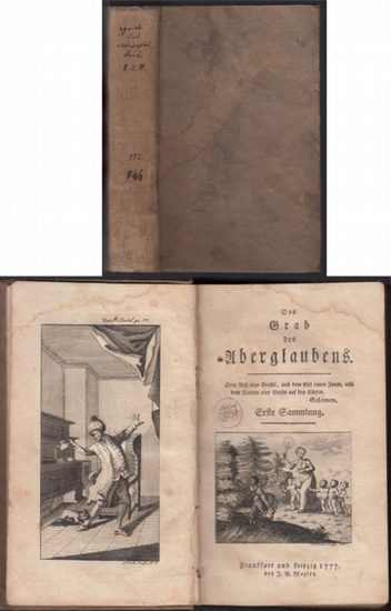 Das Grab des Aberglaubens. Erste und Zweyte Sammlung Frankfurt - Leipzig, J. B. Mezler, 1777. EA, kl 8°, geb. Pappeinbd., Frontispiz u. Titelkupfer, 226 u. 256 S. - Einband fleckig, die ersten Seiten mit kleinem Wasserrand, teilw. minimal stockfleckig, sonst innen sauber und gut erhaltenes Exemplar.