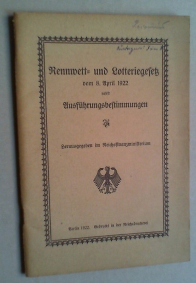 Rennwett- und Lotteriegesetz vom 8. April 1922 nebst Ausführungsbestimmungen. Hg. im Reichsfinanzministerium. Berlin, Reichsdruckerei, 1922. Gr.-8°. 83 S. OKart. (Besitzvermerk). Erste Einzelausgabe eines der ältesten deutschen Steuergesetzes, welches die Besteuerung von Wetteinsätzen bei Pferderennen, Sportwetten und Lotterien regelt und bis heute Gültigkeit grundlegende Gültigkeit hat. - Titel mit alten handschriftlichen Notizen zu späteren Gesetzesänderungen. Schönes Exemplar einer hippologischen Privatbibliothek, mit deren dezentem Stempel.