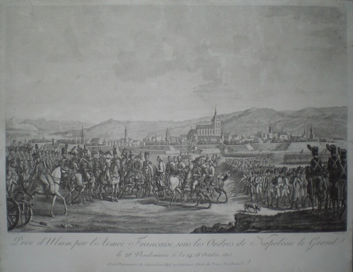 Prise d'Ulmm, par l'Armée Francaise, sous les Ordres de Napoléon le Grand le 26 Vendemiaire, An 14:18 Octobre 1805. 23,000 Prisonniers. Le Général en Chef, 17 Généraux, Fuite du Prince Ferdinand. Zeigt die Einnahme von Ulm durch die französische Armee, Napoleon und Vordergrund, im Hintergrund Ulm mit dem noch unvollendeten Münsterturm. Kupferstich von Le Beau (Pierre Adrien Le Beau 1748 bis ? Thieme-Becker XXII, 500) nach B. Pecheux (Benoit Pécheux 1779 bis 1831 Thieme-Becker XXVI, 334, mit Erwähnung des Bildes). Paris, Jean, ohne Jahr (ca., 1810). Ca. 35,5 x 53,5 cm (Darstellung ohne Schrift), ca. 43,5 x 56 cm (Blattgröße). Oben rechts gestochene Nummer 36. Gerahmt in einem breiten, zeitgenössischen Palisanderholzrahmen mit altem Glas (Rahmenaußenmaß ca. 60 x 72,5 cm). Blatt professionell gereinigt, kleine hinterlegte Einrisse.