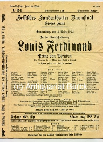 Louis Ferdinand. Prinz von Preußen. Theaterzettel für die Neueinstudierung des Stücks am Hesssichen Landestheater Darmstadt unter der Regie von Gustav Hartung. Darmstadt: ohne Druckvermerk. 1922. (falt- und knickspurig, papierbedingt gering gebräunt, Einrisse verso sauber mit Tesafilm hinterlegt, insgesamt noch ordentlich erhalten). Sehr seltener Beleg für die schauspielerische Karriere der später auch als Autorin bekannten Johanna Bleschke (1894-1936), die als "Rahel Sanzara" auftrat und veröffentlichte. Sie wurde vor allem vom Schriftsteller Ernst Weiß gefördert. In Darmstadt war sie 1921-1924 engagiert, danach zog sie sich von der Bühne zurück. Als Schriftstellerin berühmt wurde sie mit ihrem Erstling "Das verlorene Kind".
