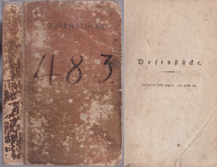 Dosenstücke Zufingen, 1802. kl 8°, geb. Pappeinbd., 303 S Äußerst rare erste Ausgabe des clandestinen erotischen Schrift. - Einband stark berieben, Notizen zum Buch auf den Innendeckeln und Vorsätzen, teilw. etwas braunfleckig. Die Seiten 101-106, 179-180, 231-232 u. 299-300.