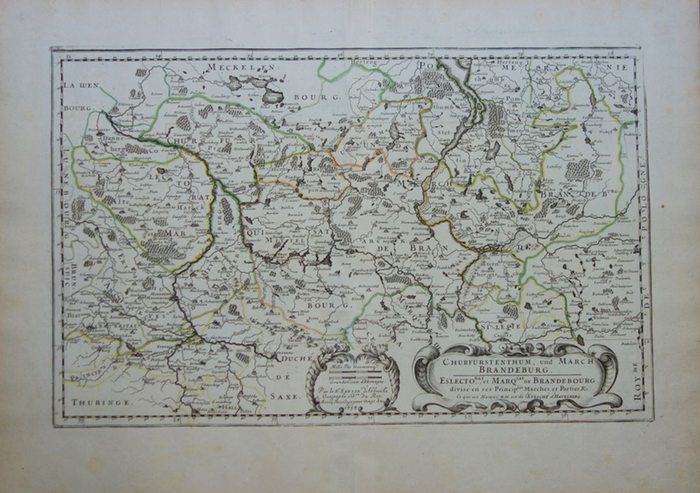 Marchesato et Elettorato di Brandeburg..., altgrenzkolor. Kupferstich von Cantelli da Vignola bei Rossi, 1687. 42x56, zeigt das Gebiet zwischen Rostock, Kolberg, Spremberg und Quedlinburg, im Zentrum Neuruppin (Alte Landkarten / Deutschland / Antique Maps / Germany).