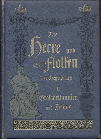 Die Heere und Flotten der Gegenwart. Band 2: Groþbritannien und Irland. Alfred Schall Verein der B�cherfreunde, Berlin (1897). XIII, 537 S. mit zahlr. farb. lithogr. Uniform- u. Flaggentafeln, Tonbildern, Textabbildungen u. mehreren Faltkarten. Gr.-8°. Blaues Leinen mit Goldpr�gung. Gering berieben. 1 Tafel lose. Stempel auf Titel. Im Ganzen schönes, innen sehr sauberes. Exemplar. Das Portr�t von Königin Victoria wurde in diesem Exemplar vom Verlag mit einem Portr�t von Edward VII. ersetzt.