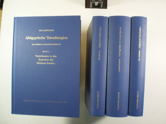Altägyptische Totenliturgien Heidelberg, Universitätsverlag Winter GmbH, 2002-2010, Auflage: 1. Leinen, gebunden; blaue, goldgeprägte Einbände / 4 Bände / Anz. Seiten: 557, 635, 564, 831 / 18 x 25 cm / Zustand: sehr gut, geringe Gebrauchsspuren; Hinterdeckel leicht berieben. Die Ausgabe beinhaltet folgende Einzelbände: Band 1: Totenliturgien in den Sargtexten des Mittleren Reiches; Band 2: Totenliturgien und Totensprüche in Grabinschriften des Neuen Reiches; Band 3: Osirisliturgien in PApyri der Spätzeit; Band 4: Die Klagelieder von Isis und Nephthys in Texten der Griechisch-Römischen Zeit.