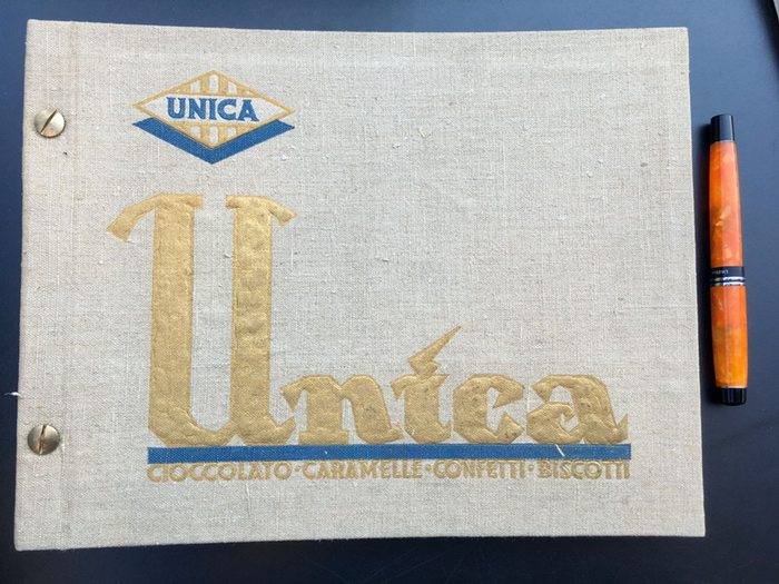 UNICA S.A. - Cioccolato - Caramelle - Confetti - Biscotti. Torino, Firmenschrift, 1930. 10 Seiten Firmengeschichte, fotogr. Abb., 63 Farbtafeln, verso Produktbeschreibungen, H 22 x 28,5 cm, Quer-4°, goldgepr. OLwd. - Firmengeschichte in 4 Sprachen (ital., span., franz. engl.); Farbtafeln mit Abb. der Produkte und der Verpackungen, teils in Gold- u. Silberdruck. Vors. m. Stempel der Keksfabrik Bahlsen, aus dem Archiv ausgemustert. Guter Zustand.