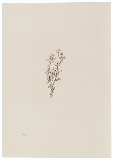 Die Riesenblattlaus. _. Lithographie, 1920, auf Bütten mit Wasserzeichen: Steigender Löwe und anhängenden Buchstaben ?JvZ?, mit Bleistift signiert. Darstellungsgröße 13,9:6 cm, Blattgröße 43,5:30,7 cm. Nr. 28 von 30 Exx. aus einer Sonderauflage ohne rückseitige typographische Bezeichnung! Provenienz: Stuttgarter Kunstkabinett, 35. Auktion, 23./24. Mai 1960, Kat. Nr. 1054. Literatur: Kornfeld 77, II A (von B), Von dieser Lithographie gibt es: 30 Exx. der Sonderauflage (s. o.), 600 Exx. erschienen in: Deutsche Graphiker der Gegenwart (darin enthalten: 100 Exx. einer Luxusausgabe) sowie 6 bekannte Probedrucke des 1. Zustandes; Söhn HDO 108-7. Erschienen in: Deutsche Graphiker der Gegenwart. Hrsg. v. Kurt Pfister. Leipzig, 1920, Blatt 10 (von 30); Katalog: German Expressionist Prints and Drawings. Los Angeles, County Museum of Art, 1989, Nr. 1498 m. Abb. Der deutsch-schweizer Künstler Paul Klee wird am 18.12.1879 in Münchenbuchsee bei Bern geboren. 1898 geht er nach München, um an der Akademie Malerei zu studieren. Paul Klee wird zunächst abgelehnt und nimmt daraufhin Zeichenunterricht in einer privaten Zeichenschule. 1900 wird er schließlich an der Akademie in die Klasse von Franz von Stuck (1863-1928) aufgenommen. Bereits 1901 verlässt Klee die Akademie wieder. 1901/02 reist er durch Italien, im Mai 1902 kehrt er nach Bern zurück. Er beschäftigt sich mit den grafischen Techniken, vor allem der Radierung. 1905 reist er nach Paris. 1906 ist Klee wieder in München, wo er nun neben seiner bildkünstlerischen Tätigkeit auch als Geiger und Musikkritiker arbeitet. Erst durch verschiedene Galeriebesuche, bei denen Klee die Werke Vincent van Goghs (1853-1890) und Paul Cézannes (1839-1906) kennenlernt, beschäftigt er sich wieder intensiver mit der Malerei. Seine ersten Ausstellungen im Kunstmuseum Bern und im Kunsthaus Zürich enthalten fast ausschließlich grafische Arbeiten. 1911 lernt Paul Klee in München Wassily Kandinsky (1866-1944), Gabriele Münter (1877-1962), Franz Marc (1880-1916), August Macke (1887-1914) und Marianne von Werefkin (1860-1938) kennen. In der ersten Ausstellung des ?Blauer Reiter? in der Galerie Thannhauser sind auch Gemälde von Robert Delaunay (1885-1941) zu sehen, mit dem sich Paul Klee in der Folgezeit intensiv auseinandersetzt. In der zweiten Ausstellung des ?Blauer Reiter? stellt Klee ebenfalls grafische Blätter aus. 1912 nimmt er an der ?Sonderbund?-Ausstellung in Köln teil. 1914 unternimmt Paul Klee mit August Macke und Louis Moilliet (1880-1962) eine Reise nach Tunis, er malt eine Vielzahl von Aquarellen und entdeckt die Farbe für sich. 1916 wird Klee als Landsturmsoldat eingezogen, die Tätigkeit in der Zahlmeisterei lässt ihm Zeit für seine Beschäftigung mit der Malerei. 1920 schließlich wird Paul Klee an die neu gegründete Bauhaus-Schule in Weimar berufen. Hier wirkt er vor allem durch seine Theorie der ?Bildnerischen Formlehre?. Ab 1931 lehrt Paul Klee an der Düsseldorfer Akademie. 1933 wird er von den nationalsozialistischen Machthabern fristlos entlassen. Er kehrt nach Bern zurück. 1935 zeigt die Kunsthalle Bern eine große Retrospektive. Im selben Jahr erkrankt Klee schwer. In den folgenden drei Jahren entstehen nur wenige Werke. Ab 1937 fühlt er sich wieder stark genug und es entsteht ein bedeutendes und großes Spätwerk. Paul Klee stirbt am 29.6.1940 in Muralto bei Locarno im schweizerischen Tessin. Von 1897-1918 führt der Künstler ein künstlerisches Ideenskizzenbuch. Sein ?Pädagogisches Skizzenbuch? veröffentlicht er in der Reihe der Bauhaus-Bücher.