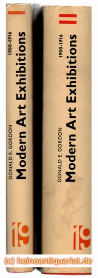Modern Art Exhibitions 1900 - 1916. 2 Bände. Selected Catalogue Documentation. Ausgewählte Katalogdokumentation. Un choix de documentation de catalogues. München, Prestel - Verlag, 1974. (24,5 x 23,8 cm); gr.-8°; 360,(1) Seiten mit 1.905 Abbildungen in Schwarzweiss ( + 1 lose beiliegendes Blatt Abbildungsregister ) und 906,(2) Seiten; Orig.-Leinwandbände; Orig.-Umschläge. ( Materialien zur Kunst des 19. Jahrhunderts Band 14 / I und II. Forschungsunternehmen der Fritz Thyssen Stiftung, Arbeitskreis Kunstgeschichte ). " Dieses Buch erfasst 851 Ausstellungen moderner Kunst, die zwischen 1900 und 1916 in 15 Ländern und 82 Städten - alphabetisch zwischen Aachen und Zürich, geographisch zwischen Tokio und San Francisco - stattgefunden haben. " Text in Deutsch, Englisch, Französisch und Russisch. Umschläge vergilbt und der Cellophanüberzug löst sich teilweise. Kopfschnitte sind angestaubt.