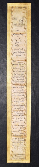 Am Geburts-Tage des Herrn Herrn Haake gewidmet von seinen (!) Freund George Dethmann. Deutsche Handschrift auf rosefarb. Seide mit kleiner Tuschezeichnung. Staßfurth (Sachsen-Anhalt), 26. März 1786. 61,5 x 7 cm. Auf goldfarb. altes Papier geheftet. Schöne in sorgfältiger Kalligraphie ausgeführte Gelegenheitsarbeit. - Mit einem langen Gedicht in 26 Versen: "Auf! Pauken und Trompeten her! / Klarnetten Flöt' und Geigen! / Laßt hören euch ihr Musiker! / Bis sich die Sterne neigen. / Kommt Freunde, kommt! / stellt euch in Reihn, / Schmückt festlich euch mit Kränzen! / Rasch Mädchens her! / mischt euch mit einz / Schickt euch zu frohen Tänzen..." - Die kleine Zeichnung am Anfang zeigt eine ovale Steinplatte an einem Baum lehnend mit der Aufschrift "Vivat Nachbar 1786". - Der Empfänger stammt mit hoher Wahrscheinlichkeit aus der Staßfurter Linie der märkischen Adelsfamilie von Hake (auch: Hacke, Hack, Haack, Hagken u. a.), die zu den bedeutendsten Adelsgeschlechtern der Mark Brandenburg gehört. Die Linie geht auf einen Ritter Hake aus Lebus zurück, der am 15. Juli 1325 zuerst urkundlich belegt ist. - Vereinzelt mit geringf. Randläsuren und etwas ausgebleicht, sonst sehr gut erhalten.