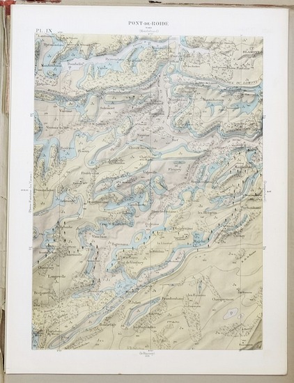 Atlas orogéologique du Département du Doubs. Echelle 1:80 000. Berthaus-Frères, Paris, 1888. 4°, 31 S. Textbeilage + 20 farblithographierte Tafeln in Halbleinwandmappe der Zeit mit Bindebändchen (Mappe berieben und bestoßen, Textteil unaufgeschnitten, die Karten in sehr schöner Erhaltung, aber alle mit Stempel). *Das Departement Doubs ist das französische Département mit der Ordnungsnummer 25. Es liegt im Osten des Landes in der Region Bourgogne-Franche-Comté und ist nach dem Fluss Doubs benannt.