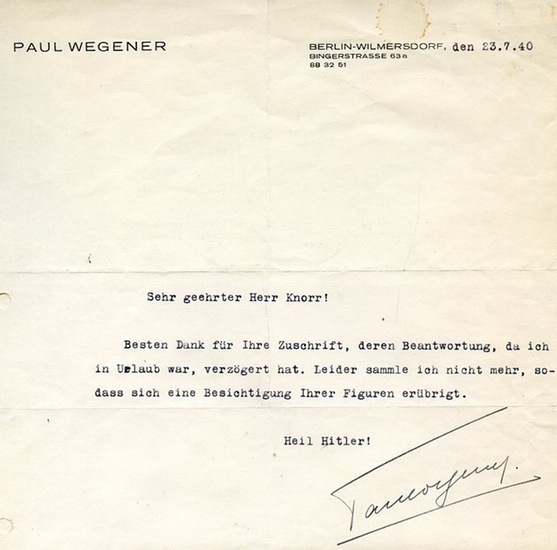 Ms. Brief mit eigenh. U. Berlin, 23. Juli 1940. ? S. Gr.-4to. An einen Herrn Knorr mit Dank für dessen Zuschrift, ?deren Beantwortung [sich], da ich in Urlaub war, verzögert hat. Leider sammle ich nicht mehr, sodass sich eine Besichtigung Ihrer Figuren erübrigt [...]?. ? Paul Wegener war seit 1905 einer der vorzüglichsten Darsteller an Max Reinhardts Deutschem Theater in Berlin, wo er u. a. als Richard III., Macbeth, Othello und Mephisto brillierte. Seit 1910 auch im Film zu sehen, spielte er in ?Der Student von Prag? (einer von rund dreißig seiner Stummfilme) die erste Doppelrolle der Filmgeschichte. Später auch als Regisseur und nach dem Krieg verstärkt wieder auf der Bühne tätig, zählt Wegener zu den großen deutschen Schauspielern der ersten Stunde. ? Auf Briefpapier mit gedr. Briefkopf; im linken Rand gelocht (keine Textberührung); mit kleineren Randläsuren und am oberen Rand etwas fleckig.