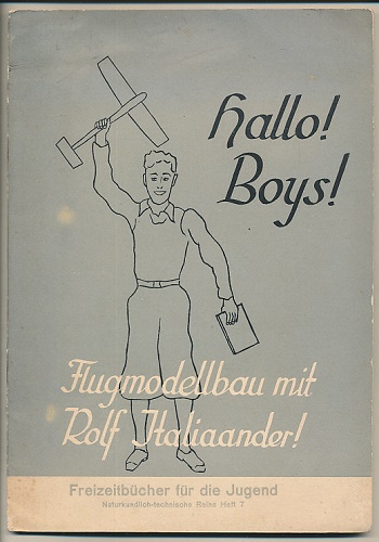 Hallo! Boys! Flugmodellbau mit Rolf Italiaander! Mit 11 Zeichnungen. Bern: Paul Haupt [1932]. 20 S. 24 x 17 cm. Original-Heft mit Deckelillustr. (= Freizeitbücher für die Jugend, H. 7.) Softcover/Paperback. Erste Ausgabe des zweiten Buches von Italiaander (1913-1991). Gut erhalten. Jugendbuch mit Anleitung zum Flugmodelbau. Im Unterschied zum ersten Buch "So lernte ich Segelfliegen" (1931) selten.
