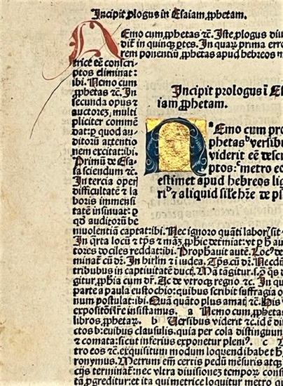 Jesaja (Isaias; Esaias). [Aus: Biblia mit Postilla des Nicolaus de Lyra]. [Nürnberg, Anton Koberger, 1487]. Fol. Mit einer goldgehöhten Anfangsinitiale u. einem Textholzschnitt. Durchg. m. eingemalten Initialen in Rot u. Blau sowie rubriziert. 82 nn. Bll. (Got. Typ., 2 Kol., 72-73 Zeilen, Text von Kommentar umgeben), Geheftet (ausgebunden; ohne Einband). Die vollständig schwer auffindbare Bibel erschien in insgesamt vier Bänden, wovon hier das komplette Kapitel Jesaja (Isaias; Esaias) vorliegt. - Zwei weiße Blätter vorgebunden. Buchblock gelockert. Die ersten 13 Bll. abnehmend wasserrandig. Initialen vereinzelt etw. verwaschen. Kopfsteg tlw. knapp beschnitten. Etw. gebräunt bzw. fleckig. - GW 4289; Hain/C. 3167; BMC II, 431; BSB-Ink B-459; Proctor 2060; ISTC ib00614000.