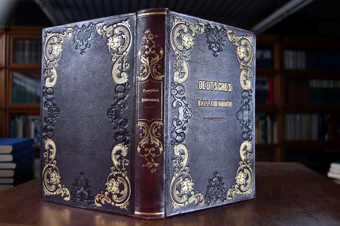Deutsches Balladenbuch. Mit Holzschnitten nach Zeichnungen von Adolf Ehrhardt, Theobald von Oer, Hermann Plüddemann, Ludwig Richter und Carl Schurig in Dresden. Leipzig, Wigand, 1852. VI, 468 S. mit Ill. 26 x 18 cm, geprägtes Leder mit umlaufenden Goldschnitt. Einband berieben. Bogen 23-25 gebräunt und fleckig. Rümann 1926. Mit Holzschnitten von Ludwig Richter (9; Hoff-B. 1834-36), Adolf Ehrhardt (43), Theobald von Oer (26), Hermann Plüddemann (29) und Carl Schurig (6). Hauptwerk der Dresdner und deutschen Buchillustration.