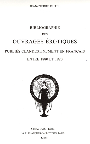Bibliographie des Ouvrages Érotiques. Publiés clandestinement en français entre 1880 et 1920. Paris, J.-P. Dutel, 2002. Gr.8°. 688 S. Orig.-Leinen mit Orig.-Umschlag. Wichtige und verdienstvolle Bibliographie, die in hoher Vollständigkeit die klandestinen französischen Werke, erschienen in Brüssel, Amsterdam, Rotterdam und Paris behandelt. Die Bibliographie erfasst minutiös 933 Ausgaben und klassifiziert die Werke nach typographischen Ornamenten und Vignetten, die sämtlich abgebildet sind, in bestimmte Gruppen von Verlegern und Herausgebern. Desweiteren sind 692 Titelseiten abgebildet. Die Bibliographie enthält Anmerkungen zu Verlegern, Druckern, Autoren und Sammlern und bringt dazu bisher unveröffentlichte Dokumente. Durch diese Arbeit wird eine für die erotische Literatur wichtige und äusserst produktive Zeit erschlossen. Er erhielt für dieses Werk den Bibliographie-Preis des französischen Antiquariats-Verbandes.