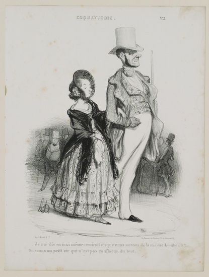 Je me dis en moi-même: croirait on que nous sortons de la rue des Lombards ?.. On vous a un petit air qui n?est pas confiseur du tout. _. Ich sage zu mir selbst: würde man glauben, dass wir aus der Rue des Lombards kommen?... Wir sehen doch gar nicht aus wie Zuckerbäcker. Lithographie, auf chamoisfarbenem Velin, mit den Adressen: Imp. D? Aubert & Cie. Sowie: Au Bureau de Charivari r. du Croissant 16. Blattgröße 33:25 cm.- Insgesamt braunfleckig. Literatur: Daumier-Register 737; Delteil 737, II (von 2), No. 2 der Serie ?Coquetterie?. (Koketterie) ist eine Serie von 10 nummerierten Lithographien, welche in der Zeit vom 7. Juli 1839 bis zum 15. November 1840 im Charivari publiziert wurden.- Sur blanc!. COQUETTERIE (Koketterie) ist eine Serie von 10 nummerierten Lithographien, welche in der Zeit vom 7. Juli 1839 bis zum 15.November1840 im Charivari publiziert wurden. Es existiert ein Album in-4° demi basane, Paris, L. Pannier, welches die folgenden kompletten Serien enthält: Coquetterie, Silhouettes, Monomanes, Scènes grotesques, Sentimens et Passions. Es kann als recht selten bewertet werden. - ZU DIESER SERIE. Daumiers Beobachtungsgabe und seine Phantasie sind in dieser Serie vereint, die die männliche Eitelkeit, die üblicherweise eher beim weiblichen Geschlecht wahrgenommen wird, ins Lächerliche zieht.
