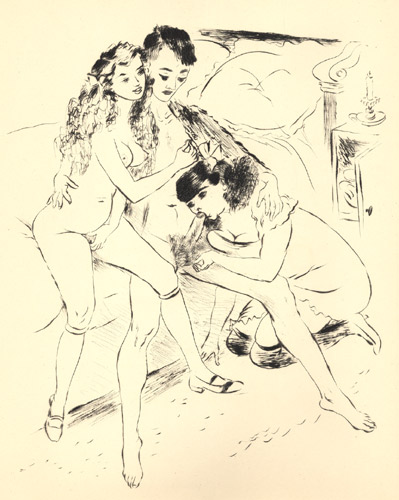 Poésies érotiques. Illustrées de vingt pointes sèches par un artiste inconnu [d.i. Berthommé Saint-André]. Mexique, Chihuahua, [Paris], Aux dépens d'un amateur, L'an I de la République [d.i 1946]. 4°. 95 nn. S. und 20 Radierungen, 15 auf Tafeln und 5 im Text. Ungebundene Lagen in der Orig.-Broschur mit Fronttitel. Mit kart. Umschlag im Pappschuber. Eins von 30 römisch numerierten Exemplaren "de présent numerotées de I A XXX". (Gesamtauflage 350). Exquisites erotisches Werk mit schönem breitrandigen Druck auf unbeschnittenem Bütten, die Versalien in zartem Flieder, illustriert mit den gekonnten Radierungen Berthommés, die in ihrer künstlerischen Ausführung und ausgesprochen freizügigen Darstellung in nichts den explizit erotischen Gedichten von Pierre Louÿs nachstehen. Schuber etw, fleckig, eine Kante gebrochen. Lagen teils leicht fingerfleckig. Gutes Exemplar dieses seltenen Werks. Dutel 2231. Simonson, Midi 154; Drouot, Imp. Biblio. 139. --------------------------- One of 30 Roman numbered copies "de présent numerotées de I A XXX". (Total edition 350). With 20 etchings by Berthommé Saint-André. Copy in sheets, in orig. wrappers. Excellent work on hand-made paper with explicit erotic etchings. Slight fingerstains. Otherwise a good copy of this rare work. -------------------------------- In-4. Un des 30 exemplaires numérotés en chiffres romains "de présent numerotées de I A XXX". (tirage total 350). 63 ff. non chifrées dont faux-titre et justification; 15 pointes sèches hors texte et 5 dans le texte [par Berthommé Saint-André]. Impression en noir et mauve. En feuilles, couverture, chemise. Dutel 2231.
