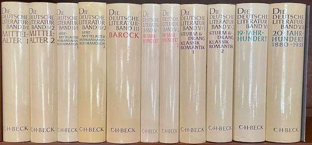 Die deutsche Literatur. Texte und Zeugnisse. Im Verein mit Helmut de Boor, Rainer Gruenter, Albrecht Schöne, Richard Alewyn, Hans-Egon Hass u. Benno von Wiese herausgegeben. 7 Bde. in 11 Bdn. - Mch.: C.H. Beck 1965-1983. Gr.8°. Dunkelblaues Ln. mit goldgeprägt. Rücken- u. Deckeltitel (Bd. VII am Kopf min. angestaucht). ERSTE AUSGABE. - Die reichhaltige, gut erläuterte Anthologie enthält neben literarischen auch theologische, philosophische und ästhetische Texte, Beschreibungen und Erinnerungen, Briefe und Reden sowie, in den früheren Epochen, Predigten, Traktate und Flubblätter; "... es durfte nicht nur auf die Wiedergabe des 'Besten' ankommen ...; wichtig war, das für die Epoche Bezeichnende zu finden, in dem sich die Eigentümlichkeit des damals Alltäglichen realisiert, und das ist keineswegs immer im geprägten Stil oder im Kunstwerk von Rang der Fall." (Geleitwort Bd. I, S. VI). Inhalt: I.1-2 Mittelalter. Hrsg. von Helmut de Boor; II.1-2 Spätmittelalter, Humanismus, Reformation. Hrsg. von Hedwig Heger; III. Barock. Hrsg. von Albrecht Schöne, 2., verbesserte u. erweiterte Aufl.; IV.1-2 18. Jahrhundert. In Verbindung mit Christoph Pegels hrsg. von Walther Killy; V.1-2 Sturm und Drang, Klassik, Romantik. Hrsg. von Hans-Egon Hass; VI. 19. Jahrhundert. Hrsg. von Benno von Wiese; VII. 20. Jahrhundert. 1880-1933. Hrsg. von Walther Killy. - Der Literaturwissenschaftler Walther Killy (1917-1995) wurde bekannt durch die Herausgabe des Literaturlexikons und der 'Deutschen Biographischen Enzyklopädie'. - Kosch3 VIII,1162. - Umschlagentwurf von Christl Kreutner. - Beilage: Die Deutsche Literatur vom Mittelalter bis zum 20. Jahrhundert. Texte und Zeugnisse. Gesamtregister. Mch.: Dt. Taschenbuch Vlg. 1988. 16 Ss. 8°. Illustr. Br. - Das zur seitengleichen Taschenbuchausgabe erschienene Register umfaßt alle im Gesamtwerk vertretenen Autoren sowie die anonymen Werke.