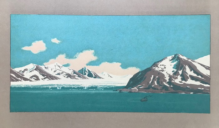 Ins Land der Mitternachtssonne Tagebuch eines Malers. Schilderungen von der Nordlandreise der "Auguste Victoria" vom 2. Juli bis 24. Juli 1898, "Die Illustrationen sind von mir auf Stein gezeichnet und unter meiner Leitung gedruckt in der Kunstdruckerei des Künstlerbundes Karlsruhe. (G. Braunsche Hofdruckerei) Meiner lieben Frau Margarrethe zugeeignet". Selbst Verlag [1899]. mit einem farbig illustrierten Titelblatt und 52, teils ganzseitigen, teils farbigen lithographierte Blätter und einer lose beiliegenden Karte 31 x 43 cm, rotes, goldgeprägtes O Ln,. SCHÖNES EXEMPLAR! Lediglich das Papier alterentsprechend gleichmäßig gebräunt.
