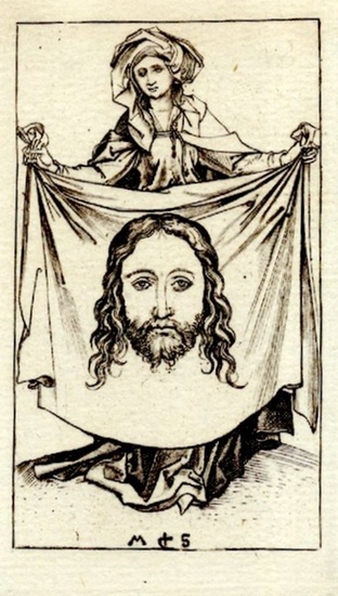 Die Heilige Veronika | St. Veronica | Sainte Véronique. Heliogravüre von Charles Amand-Durand nach einem Kupferstich von Martin Schongauer (um 1480). Paris, Amand-Durand, [ 1881]. 8,5 x 4,9 cm (Einfassung). Blattmaß 9,9 x 6 cm. Verso mit dem rotem Orig.-Stempel des Stechers. Unter Feinkarton-Passepartout. [vgl. Lehrs 71; Bartsch 66; Hollstein 71]. - Sujet: Veronika mit dem Schweißtuch Christi. - Martin Schongauer (um 1450-1491), dt. Kupferstecher und Maler der Renaissance. - Charles Amand-Durand (1831-1905), frz. Kupferstecher, Kunstverleger und Erfinder e. Verfahrens zur Reproduktion von Altmeistergraphiken des 15. bis 17. Jahrhunderts um sie so vor dem Verfall und Vergessen für die Nachweltzu bewahren. Nach den besterhaltenen Originalabzügen aus Museen und Archiven fertigte er im präzisierten Verfahren Druckstöcke in Originalgröße an, die von Hand einzeln eingefärbt und auf hochwertigem Papier gedruckt wurden. Diese verso mit s. roten "HELIO"-Stempel gekennzeichneten Heliogravüren sind seit dem 19. Jhdt. bei Sammlern und Institutionen begehrt.