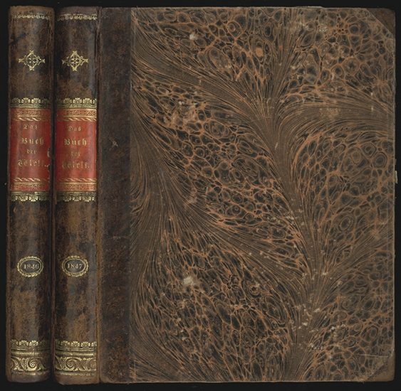 Das Buch der Welt. Ein Inbegriff des Wissenswürdigsten und Unterhaltendsten aus den Gebieten der Naturgeschichte, Naturlehre, Länder- und Völkerkunde, Weltgeschichte, Götterlehre etc. Stuttgart, Carl Hoffmann 1846-1847. Jgge. 1846 - 1847. 2 Bde. 4°. Je 1 Tit., lithograph. Tit. u. Stahlstichfrontisp. Mit insges. 95 Taf. (dav. 71 kolor. Lithogr., 24 Stahlstiche). Restaurierte HLdr.-Bde. d. Zt.m. goldgeprägt. Rückenschildchen u. Marmorpapierbezug. Vors. erneuert. Kanten leicht berieb. Innen teils leicht gebräunt, sonst sehr gut erhalten. vgl. Wegehaupt IV, 2607 (Jg. 1866); vgl. Nebehay-W. 1024 - Schön ausgestattetes Anschauungsbuch mit zahlreichen prächtig kolorierten Abbildungen von Pflanzen (Beeren, Trauben), Tieren (Nahorn, Giraffe, Käfer, Schmetterlinge, Muscheln, Vögel, Fische, Affen, Reptilien) und einigen Ortsansichten. Das Jahrbuch erschien von 1842-70.