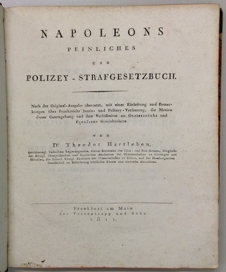 Napoleons Peinliches und Polizey-Strafgesetzbuch. Nach der Original-Ausgabe übersetzt, mit einer Einleitung und Bemerkungen über Frankreichs Justiz- und Polizey-Verfassung, die Motive dieser Gesetzgebung und ihre Verhältnisse zu Oesterreichs und Preussens Gesetzbüchern. Frankfurt, Varrentrapp, 1811. 4to. 20, 68, 182 S., 1 weißes Bl., XXVIII S. Halbleder d. Zeit (beschabt, Ecken u. Kanten bestoßen). Hartleben (1770-1827) war Übersetzer u. Herausgeber einer Ausgabe des Napoleonischen Code criminel (1811) sowie Herausgeber verschiedener Zeitschriften. - Etwas gebräunt u. stockfleckig, gegen Ende auch wasserrandig. Im Fußsteg durchgehend mit mehreren Wurmstichen, teils auch im oberen Bundbereich.
