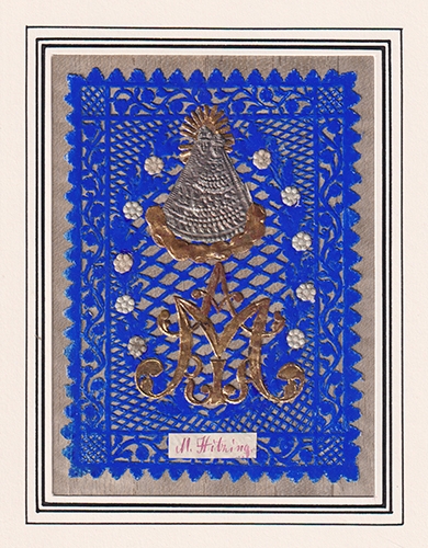 M. Hitzing. o. O. [um 1850]. Reliefgeprägte Metallfolie auf blauer Stanzspitze und imitierter Baumrinde 10, 8 x 7, 7 cm. (Stanzspitzengr.). Minimal berieben, sonst gut erhalten. Über angedeuteten Wolken ist eine Prägeapplikation der Gnadenstatue von Maria-Hietzing im 13. Wiener Gemeindebezirk zu sehen. Der Legende nach sollen im Zuge der Ersten Türkenbelagerung Wiens 1529 einige Männer an einen Baum gebunden worden sein. Die im Baum vor den Türken versteckte Gnadenstatue erhörte die Hilferufe der Männer und befreite sie auf wundersame Weise. Die Gnadenstatue befindet sich bis heute in der Pfarrkirche Maria Hietzing.