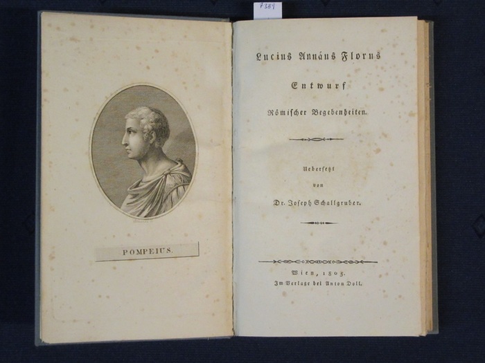Entwurf Römischer Begebenheiten. Uebersetzt von Dr. Joseph Schallgruber. Wien: Doll, 1805. 8°, 223, (2) S. und ein Kupferporträt ("Pompeius") von Blaschke. Jüngerer blauer Pappband mit rotem Lederrückenschild. (223 S.; die Vorrede ist römisch paginiert) - Zustand: schwach stockfleckig, selten etwas stärker.