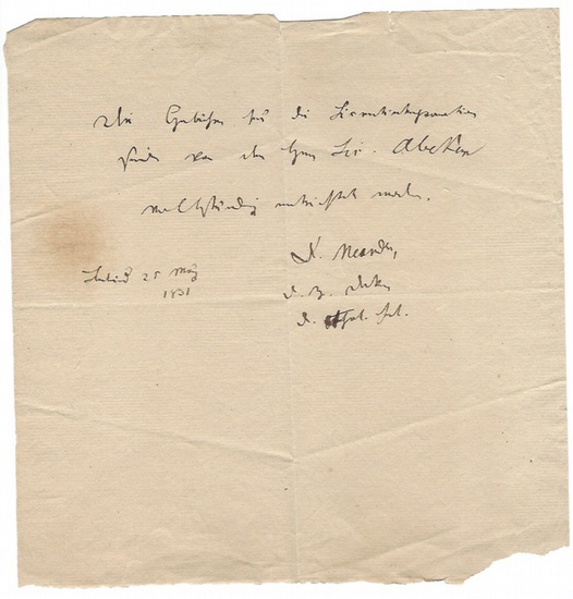 Eigenh. Bestätigung mit U. (?D Neander?). Berlin, 25. Mai 1831. ? S. Kl.-4to. ?Die Gebühren für die Licentiatenpromotion sind von dem Herrn Lic. Abesser [?] vollständig entrichtet worden [...]?. ? August Neander war Ordinarius der Kirchen- und Dogmengeschichte in Berlin, wurde 1836 Konsistorialrat und 1839 Mitglied der Preußischen Akademie der Wissenschaften. ?1849 begründete er mit Carl Immanuel Nitzsch und Julius Müller die ?Deutsche Zeitschrift für christliche Wissenschaft und christliches Leben?. Von Schleiermacher beeinflußt, entwickelte sich Neander im Sinne der Erweckungsfrömmigkeit zu einem der führenden Neupietisten. Seine Kirchengeschichtsschreibung war von dem Grundsatz ?pectus est, quod theologum facit? (das Herz macht den Theologen) geprägt? (DBE). ? Papierbedingt etwas gebräunt und mit kleinen Randläsuren.