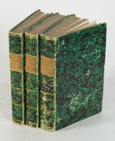 Ausführliche Darstellung der Nationalökonomie oder der Staatswirthschaft 3 Bände. Aus dem Französischen der fünften Ausgabe übersetzt und theils kritisch, theils erläuternd glossirt, sowie mit einem vollständigen Real-Auszuge von Say's Cours d'Économie politique pratique begleitet von Carl Eduard Morstadt. 3., äußerst stark vemehrte Ausgabe. Stuttgart, Hausmann, 1833. XX, 622; IV, 544; IV, 551 S.. marm. Pappbände. Einbände berieben, Ecken bestoßen. Stockfleckig. Der erste Band durchgehend etwas wasserrandig.