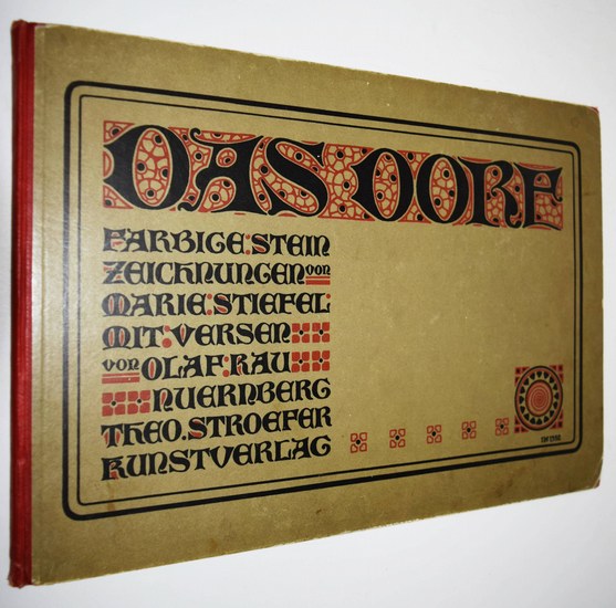 Das Dorf in Bild und Wort. Nürnberg, Theo. Stroefer, o. J. (1906). Quer-4° (24,5 x 36 cm.). 36 S. mit farbig illustr. Titel, 12 farblithogr. Tafeln und Vignetten von Marie Stiefel. Farbig illustr. Orig.-Halbleinenband. (Verlags-Nr. 1352). Bilderwelt 502. Ries 906, 1. SBI 199 und S. 75 (mit Abb. u. Farbabb. auf Tafel 11). Stuck-Villa I, 501 und II, 325 (mit Farbabb. S. 148). Nicht bei Rammensee. - Erste Ausgabe dieses seltenen Jugendstilbilderbuchs. - "Sachschilderung, jahreszeitliche Stimmung und Lokalkolorit gehen in diesem Buch der Schweizer Illustratorin Marie Stiefel (1879-1962) eine geglückte Verbindung ein. Es handelt sich wohl um das schönste Beispiel Schweizer Heimatkunst im Bilderbuch, das merkwürdigerweise in einem deutschen Verlag (zugleich auch in einer Ausgabe ohne Text auf Pappe) erschienen ist" (H. Ries in Bilderwelt). - Die Züricher Künstlerin studierte nach einer Ausbildung an der Kunstgewerbeschule Zürich (1896-1900) und im Atelier E. Grasset in Paris (1900-1903) in München und Florenz. "In ihrem Bilderbuch "Das Dorf" wechseln stimmungsvolle Landschaftsbilder mit informativen, sachbuchartigen Ansichten von verschiedenen Bereichen eines Bauernhofes. Die sorgfältige Ausstattung, vom schön gestalteten Vorsatzblatt über den Titel und die mit Ornamenten und Vignetten geschmückten Zwischenseiten bis hin zu den eindrucksvollen Farbtafeln, machen das Buch zu einem besonders schönen Beispiel des Künstlerbilderbuchs" (V. Rutschmann). - Deckel leicht angestaubt, Kanten etwas berieben, gutes Exemplar.