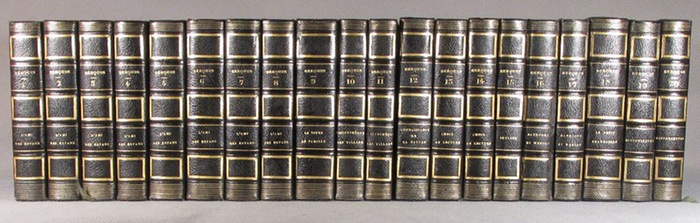 Oeuvres de Berquin, Nouvelle Édition, ornée de gravures, revue par un ancien professeur Paris, 20 Bände, Ganzleder-Ausgabe. Paris, Nepveu, 1825. Schwarze Original-Halblederbände mit goldgeprägten Rückentiteln. Enthalten sind 49 ganzseitige Kupferstich-Illustrationen. Eine der hübschesten Sammlungen französischer Jugendliteratur. Vol. 1 - 8: L'ami des enfans. Vol. 9: Le livre de famille. Vol. 10 -11: Bibliothèque des villages. Vol. 12: Introduction familière à la connaissance de la nature. Vol. 13 - 14: Choix de lecture. Vol. 15: Idylles. Vol. 16 - 17: Sandford et Merton. Vol. 18: Le Petit Grandisson. Vol. 19 - 20: Historiettes. Deckelbezüge partiell leicht berieben; Seiten partiell etwas fleckig. Sonst sehr gutes Exemplar. Couverture légèrement frottée par endroits ; pages légèrement tachées par endroits. Sinon, un très bon exemplaire.