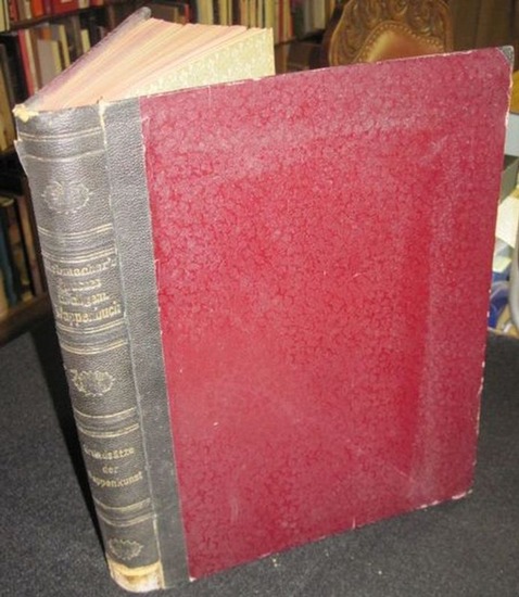 Handbuch der heraldischen Terminologie in zwölf (germanischen und romanischen) Zungen, enthaltend zugleich die Haupt-Grundsätze der Wappenkunst. Systematisch, kritisch, historisch zusammengestellt. (= J. Siebmacher's grosses und allgemeines Wappenbuch in einer neuen, vollständig geordneten und reich vermehrten Auflage mit heraldischen und historisch-genealogischen Erläuterungen, Einleitungsband, Abt. B). Nürnberg, Verlag von Bauer und Raspe (Küster), 1890. Erste Ausgabe. 4°. Schwarzer Halbleinenband der Zeit mit goldgeprägtem Rückentitel. Kapital unten mit 3cm Fehlstelle, oben bis zu 4 cm eingerissen, Buchblock etwas schief. (4), V, 325 (+2) Seiten mit einigen Figuren im Text sowie 36 getönte, lithographische Tafeln jeweils gegenüberliegend ein Erklärungsblatt ( ein Erklärungsblatt zur ersten Tafel gibt es nicht). Im Innenbereich schön sauber, fest in der Bindung. Vom Einband abgesehen in gutem Zustand. Genea.