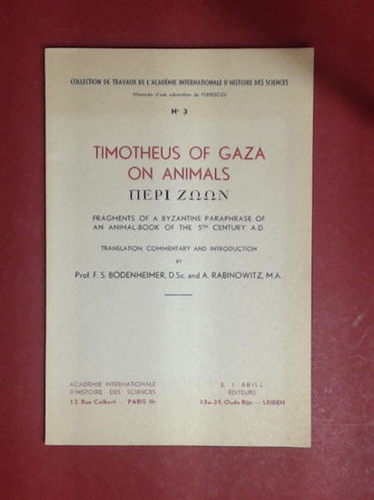 Timotheus of Gaza on Animals. Fragments of a Byzantine Paraphrase of an Animal-Book of the 5th Century A.D. Translation, Commentry and Introduction by F. S. Bodenheimer and A. Rabinowitz. Number 3 out of the series " ^Paris: Academie Internationale d`Histoire des Science / Leiden: Brill, (ohne Jahresangabe) ca. 1950. 54 Seiten. Original-Broschur. Gutes Exemplar mit nur leichten Gebrauchsspuren. Textsauber und aus einem Nichtraucherhaushalt. Dieses Exemplar ist unaufgeschnitten: Die Seiten müssen zum Lesen von Hand aufgeschnitten werden. // Original softcover. Good copy with only light signs of use. Clean text and from a non-smoking household. This copy is unopened: The pages must be cut open by hand for reading.