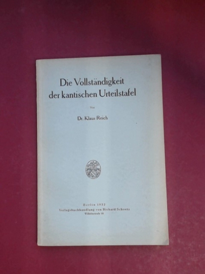 Die Vollständigkeit der kantischen Urteilstafel. Berlin: Schoetz, 1932. 95 Seiten. Original-Broschur. Gutes Exemplar mit nur leichten Gebrauchsspuren. Textsauber und aus einem Nichtraucherhaushalt.