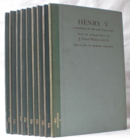 Facsimile(s) of the first Folio text(s). With an introduction (in every volume) by J. Dover Wilson and a list of modern readings. London: The Chiswick Press for Faber & Gwyer. (um 1950). Zus. ca. 300 S. Folio (32,3 x 21 cm).. 9 Bände der Faksimile-Reihe - 9 volumes of this facsimile series. Einbände berieben sowie etwas fingerfleckig und gebräunt; Ecken bestoßen; kleinere Bezugsfehlstellen an den Kanten; Kapitale teils mit winzigen Bezugsläsuren; 3 Bände mit kleinen Bezugsfehlstellen an den Gelenken; jeweils goldgepr. Bibliothekssignatur und Bibliotheksblindstempel auf dem Vorderdeckel und großes Bibliotheksexlibris ("City of Westminster. Public Libraries") sowie Stempel auf dem vorderen Innendeckel; Abgabestempel "Withdrawn from Westminster Libraries" und kleiner Kulistrich auf den Exlibris; 1 Band mit kleinem Stempel auf dem Titel; teils gering fingerfleckig; Druck auf Maschinenbütten - unbeschnitten. Vorhanden sind: Macbeth, Julius Caesar, Henry V, The Tempest, Coriolanus, Twelfth Night, The Winters Tale, As you like it, Antonius and Cleopatra.